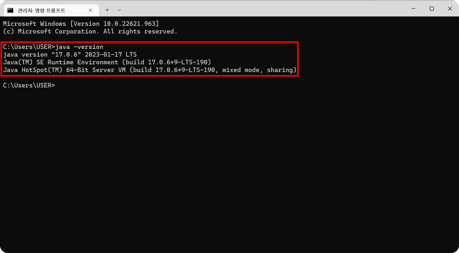 java -version명령 프롬프트(CMD)에서 java -version 명령어를 입력하면 설치한 자바 버전을 확인 할 수 있습니다.