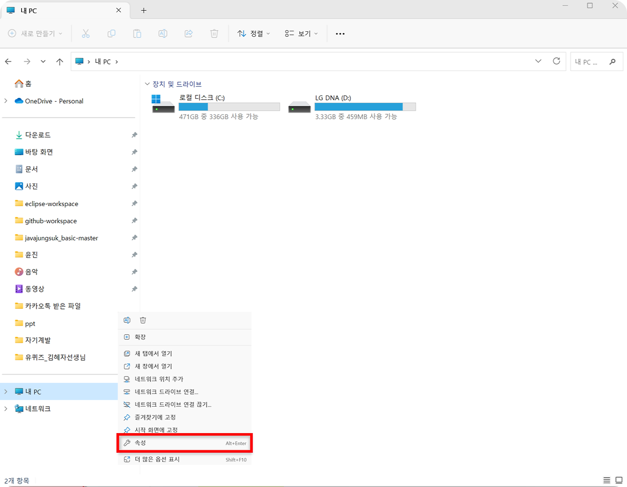 2.1.1. 내 PC 마우스 우클릭하여 [속성]을 클릭합니다.