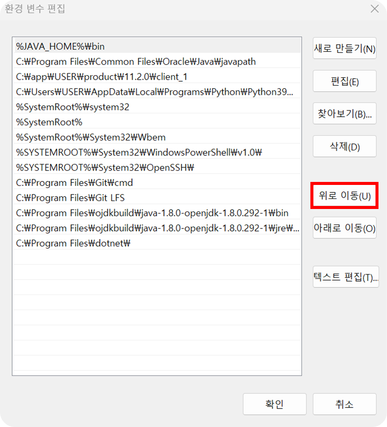 등록한 % JAVA_HOME%\n을 선택하고 [위로 이동] 버튼을 클릭해서 첫 번째 항목으로 올려줍니다. 그 후 모든 대화 상자의 [확인] 버튼을 클릭하여 환경 변수 설정을 마칩니다.