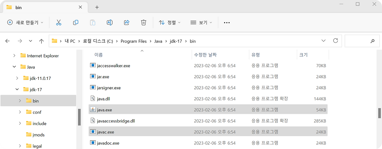 [파일 탐색기]에서 JDK 17 설치 경로(C:\Program Files\Java\jdk-17)를 열어봅니다. 해당 경로의 [bin] 폴더로 이동합니다. bin 폴더에는 다양한 명령어들이 있습니다. 대표적인 명령어 2가지가 있습니다. 자바 소스를 컴파일해 주는 javac 명령어와 컴파일된 자바를 실행해 주는 java 명령어가 있습니다. 개발자가 명령 프롬프트(cmd.exe)에서 명령 라인에 사용되는 명령어로 컴파일하고 실행할 때 사용됩니다. 그러나 bin 폴더 안에 있기 때문에 환경변수 bin 폴더 경로를 등록하여 다른 폴더에서도 실행 가능하게 환경변수에 %JAVA_HOME%/bin(C:\Program Files\Java\jdk-17\bin)를 추가해 줍니다. 다음은 윈도우 11에서 Path 환경 변수에 bin 폴더를 등록하는 순서입니다.