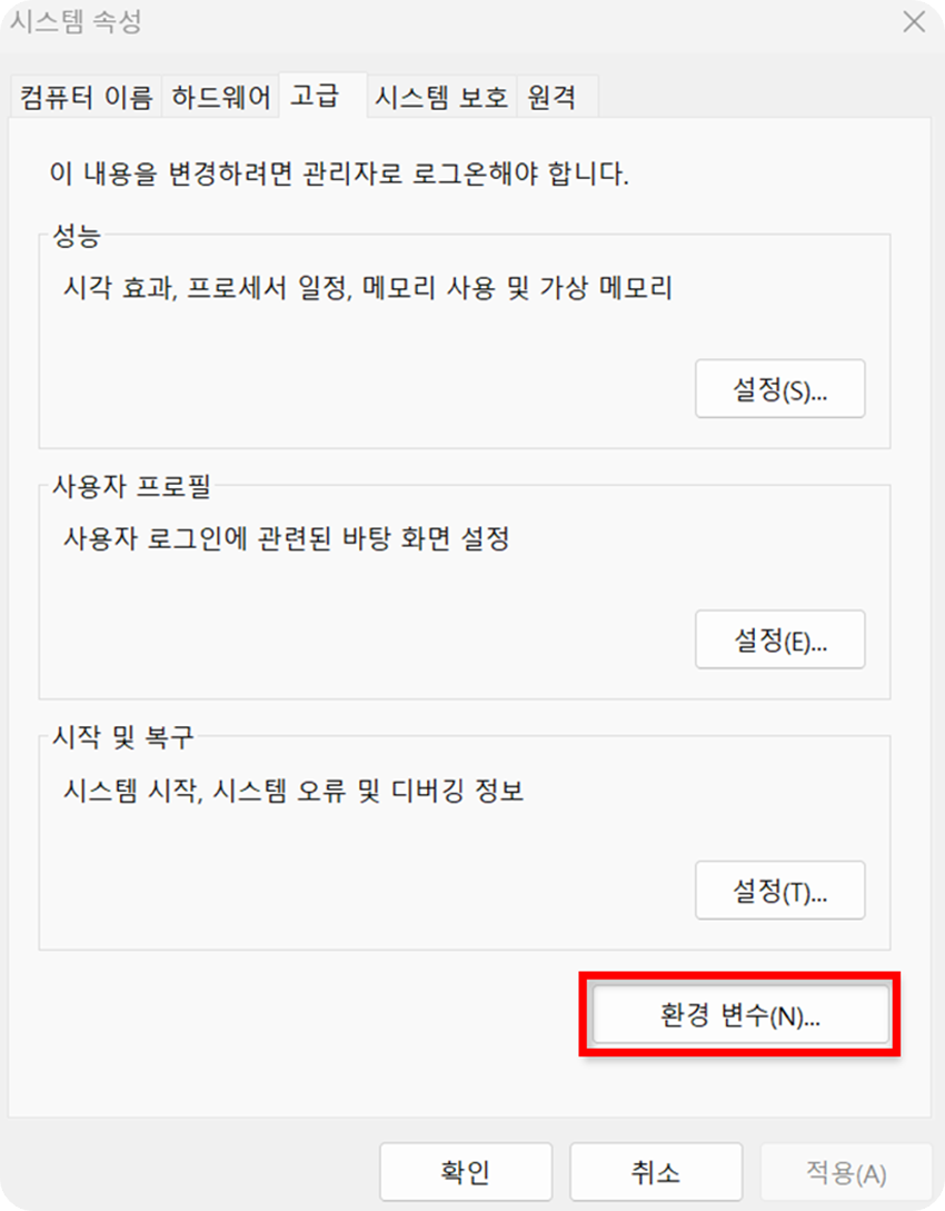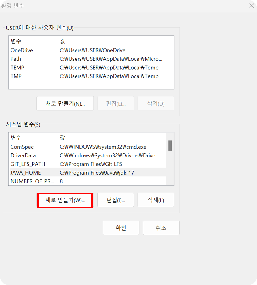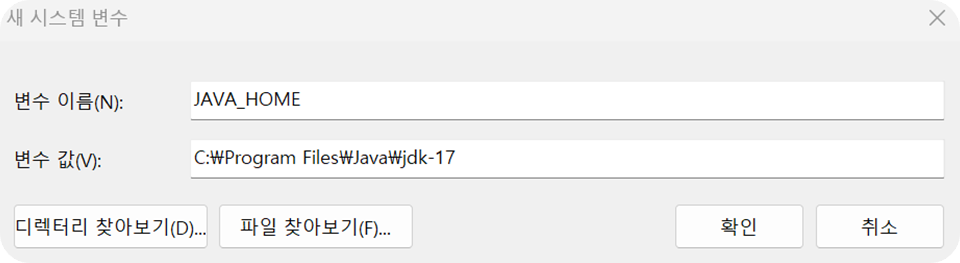 변수 이름(N) : JAVA_HOME 변수 값(V) : C:/Program Files/Java/jdk-17 (설치경로)JAVA_HOME은 JDK가 설치된 경로입니다. 설치 경로를 시스템 변수에 설정을 하면 현재 사용자뿐 아니라 다른 사용자 계정으로도 해당 변수를 사용할 수 있습니다. 또한, 다른 프로그램에서 JAVA_HOME 환경 변수를 이용해 JDK의 위치를 찾기도 합니다.