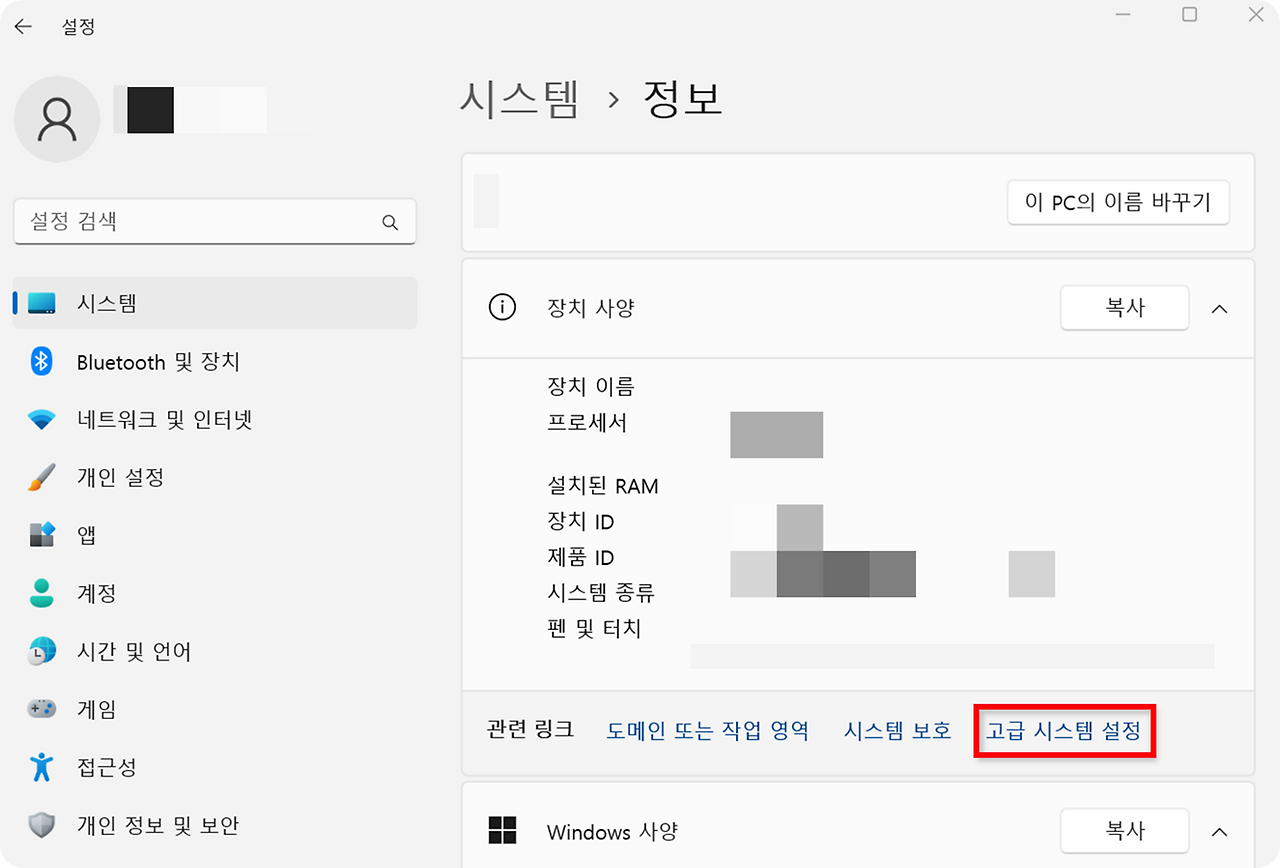 2.1.2. 시스템 정보 [고급 시스템 설정]을 클릭합니다.