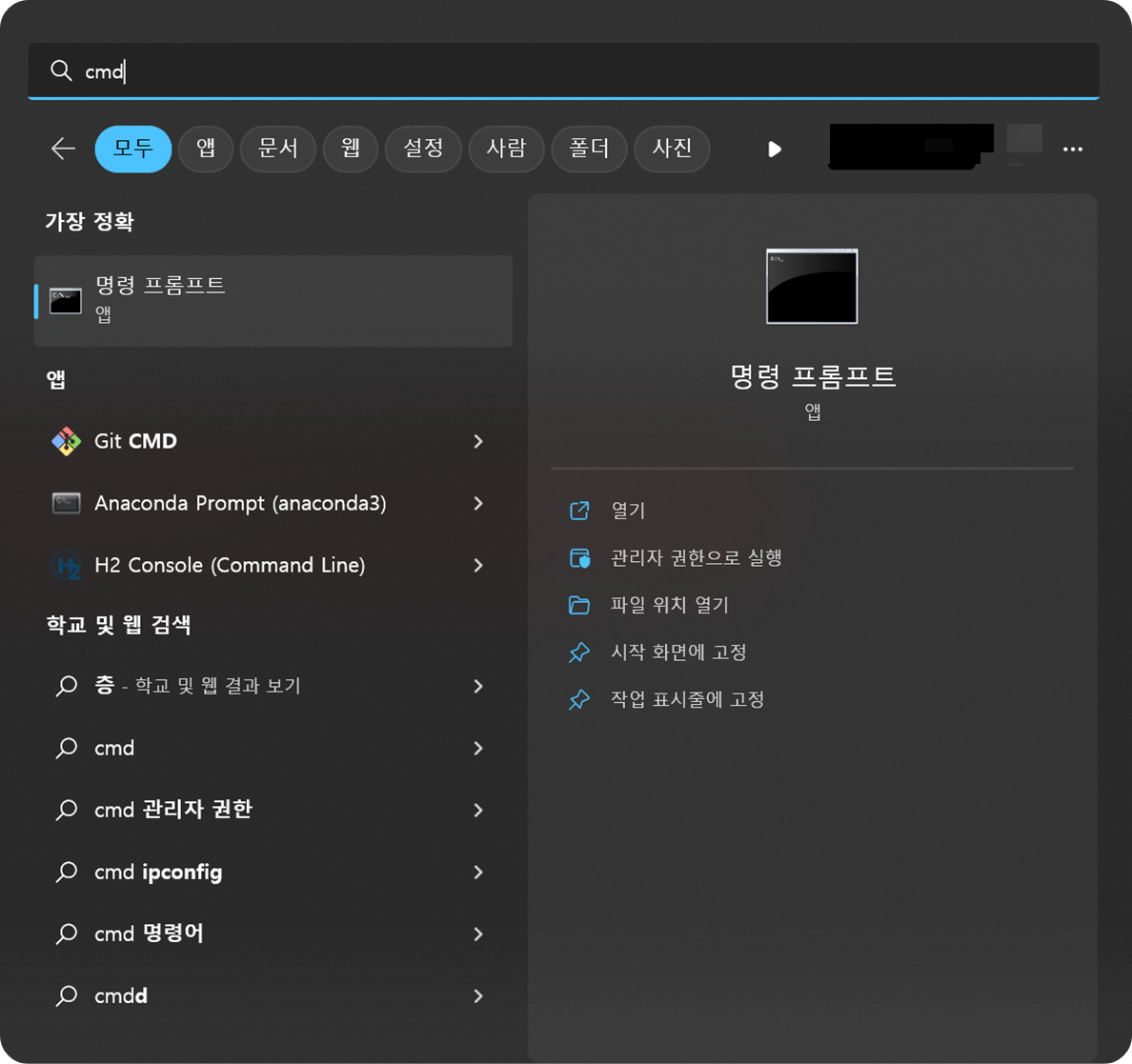 [시작] 버튼을 클릭하고 [프로그램 및 파일 검색] 검색창에 cmd 또는 명령 프롬프트를 입력 후 [명령 프롬프트]를 실행합니다. 다음 아래와 같이 java 버전 정보가 출력된다면 정상적으로 환경 변수가 설정 되었습니다.