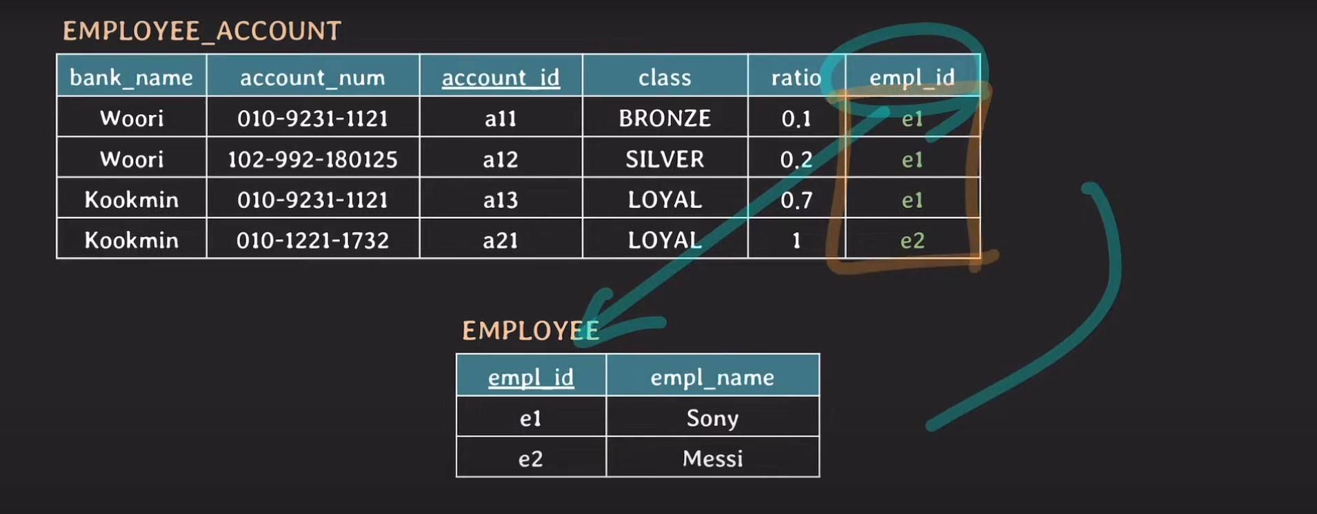 나중에 서로 연결된 데이터를 알고 싶으면 각 나눈 테이블들을 JOIN하여 찾아내야한다