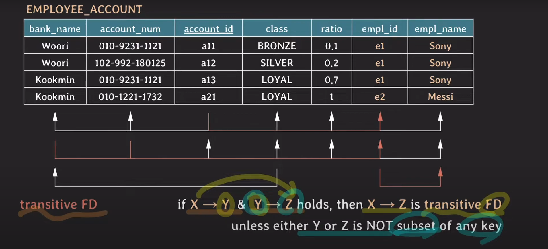 추가적으로 transitive dependent 관계일때 Y나 Z는 key의 부분집합 즉 key의 attribute이면 안됨!