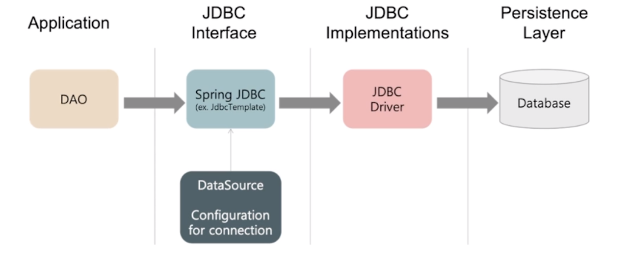 이 JDBC는 DB에 접근해서 쉽고 효율적으로 CRUD를 수행하고, 고성능에서의 세련된 메소드를 제공하며 쉽게 프로그래밍 할 수 있게 해준다.SpringBoot와 DB를 연결하기 위한 최소한의 기능을 가지고 있다. (쿼리는 개발자가 작성)