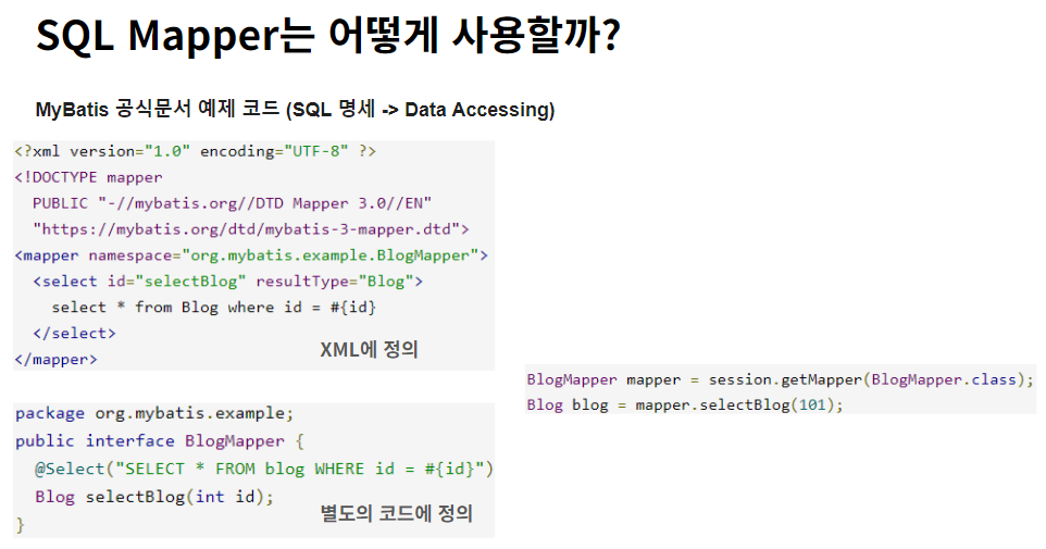 MyBatis를 사용하여 Java의 비즈니스 로직 구현 부분과 SQL쿼리를 분리할 수 있습니다. 보통은 XML형식의 파일에 각각의 메서드와 실행시키고자 하는 SQL문을 매핑시켜놓습니다. 또한 Java코드내에서도 이를 수행할 수 있는데 아래 그림의 좌측 하단 부분의 코드가 이에 해당한다고 볼 수 있습니다. 이러한 경우 파일 형식을 통하여 물리적으로 Java코드와 SQL을 분리하는 SQL Mapper의 이점은 다소 상실하는 것 같습니다.